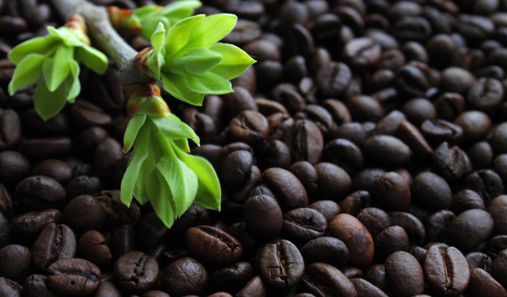 Wallpaper Lots of roasted coffee beans with a branch with green leaves