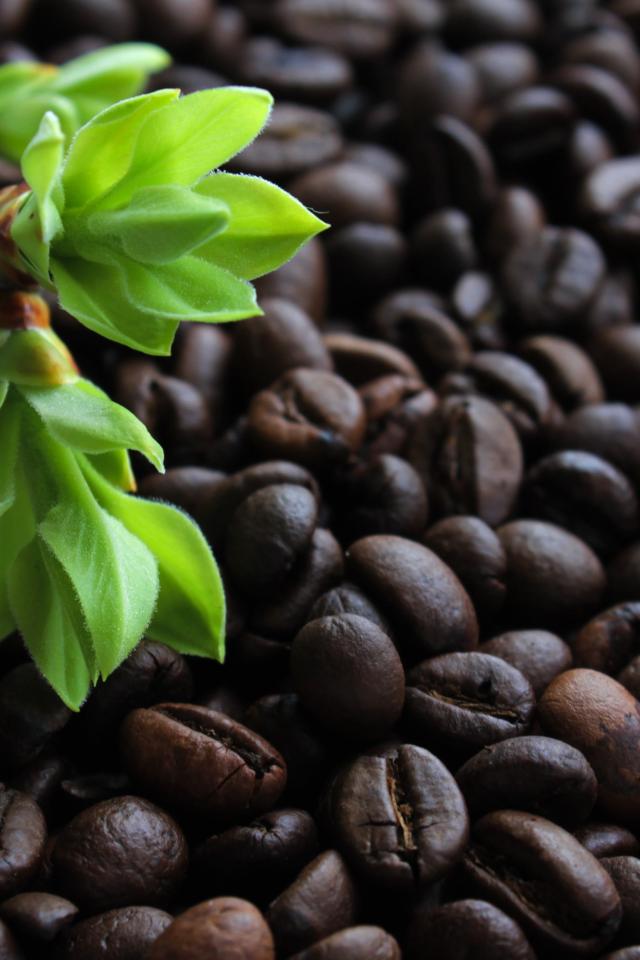 Wallpaper Lots of roasted coffee beans with a branch with green leaves