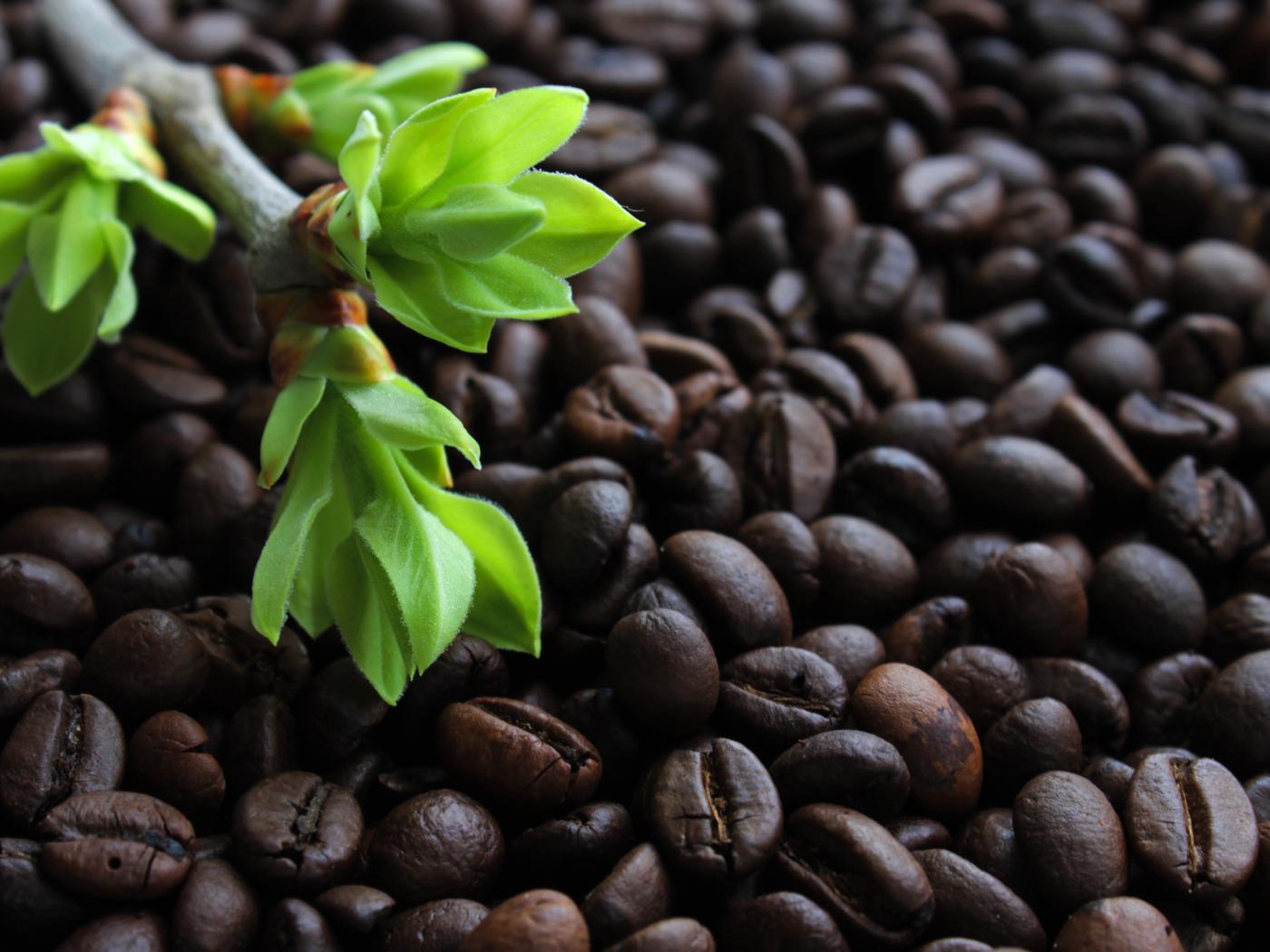 Wallpaper Lots of roasted coffee beans with a branch with green leaves
