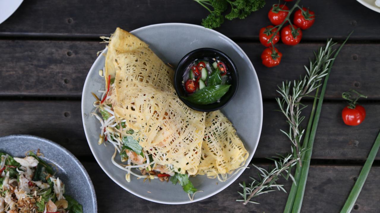 Wallpaper Pancake with salad on a plate on a table with tomatoes