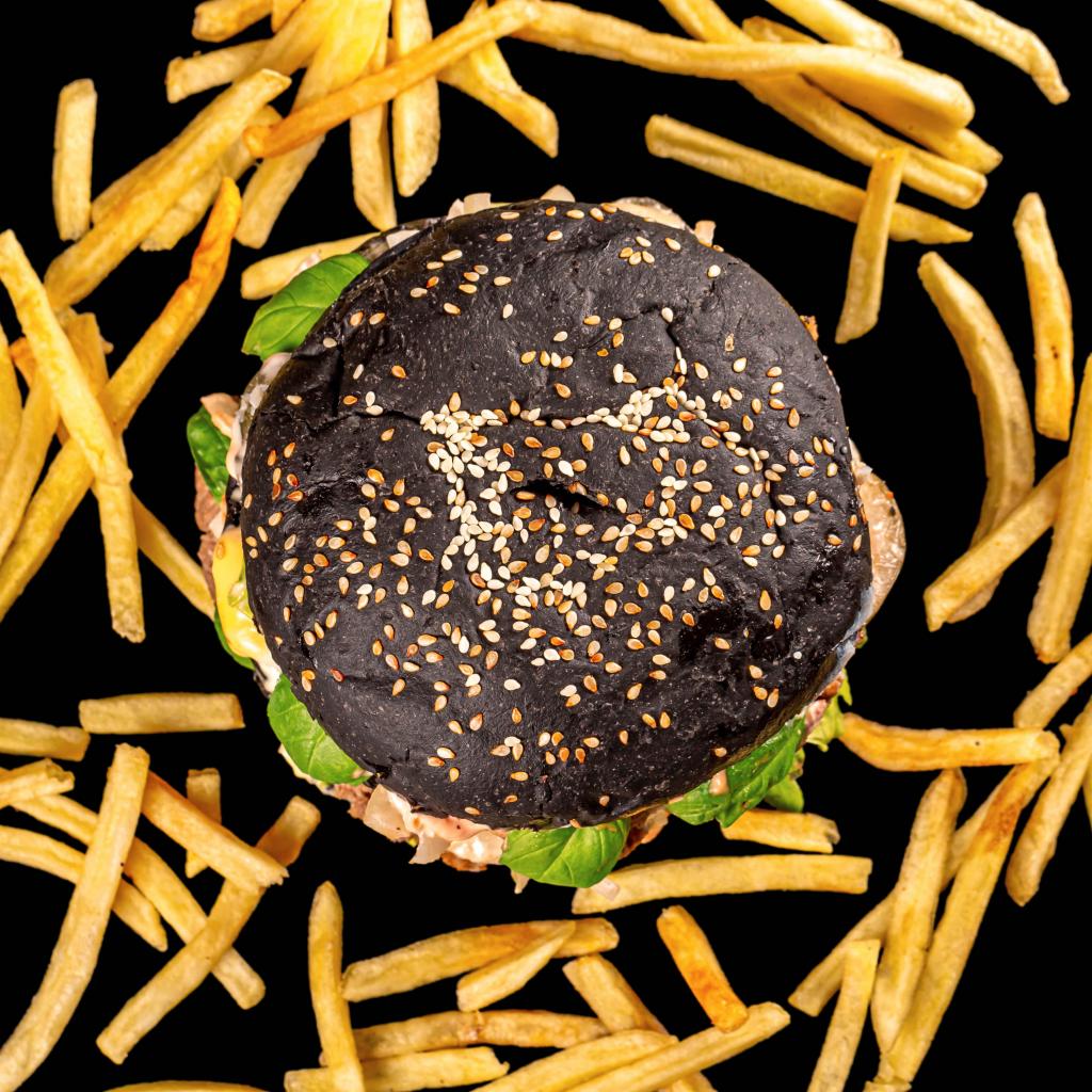 Wallpaper Hamburger on black background with fries