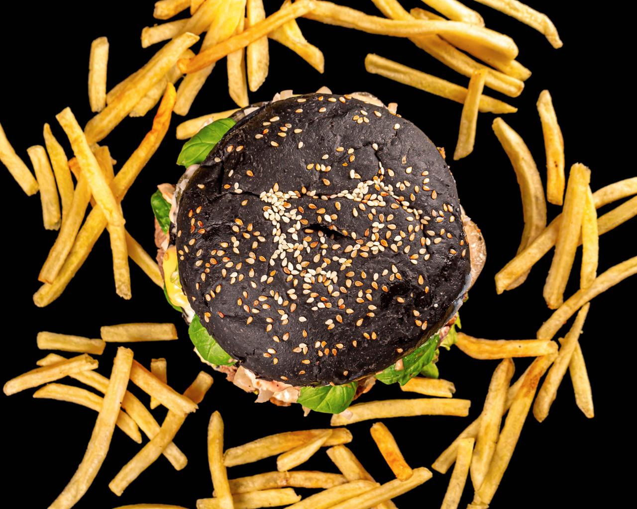 Wallpaper Hamburger on black background with fries