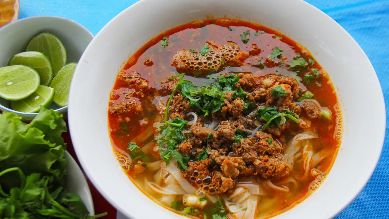 Wallpaper Spicy soup with noodles and meat in a plate with herbs
