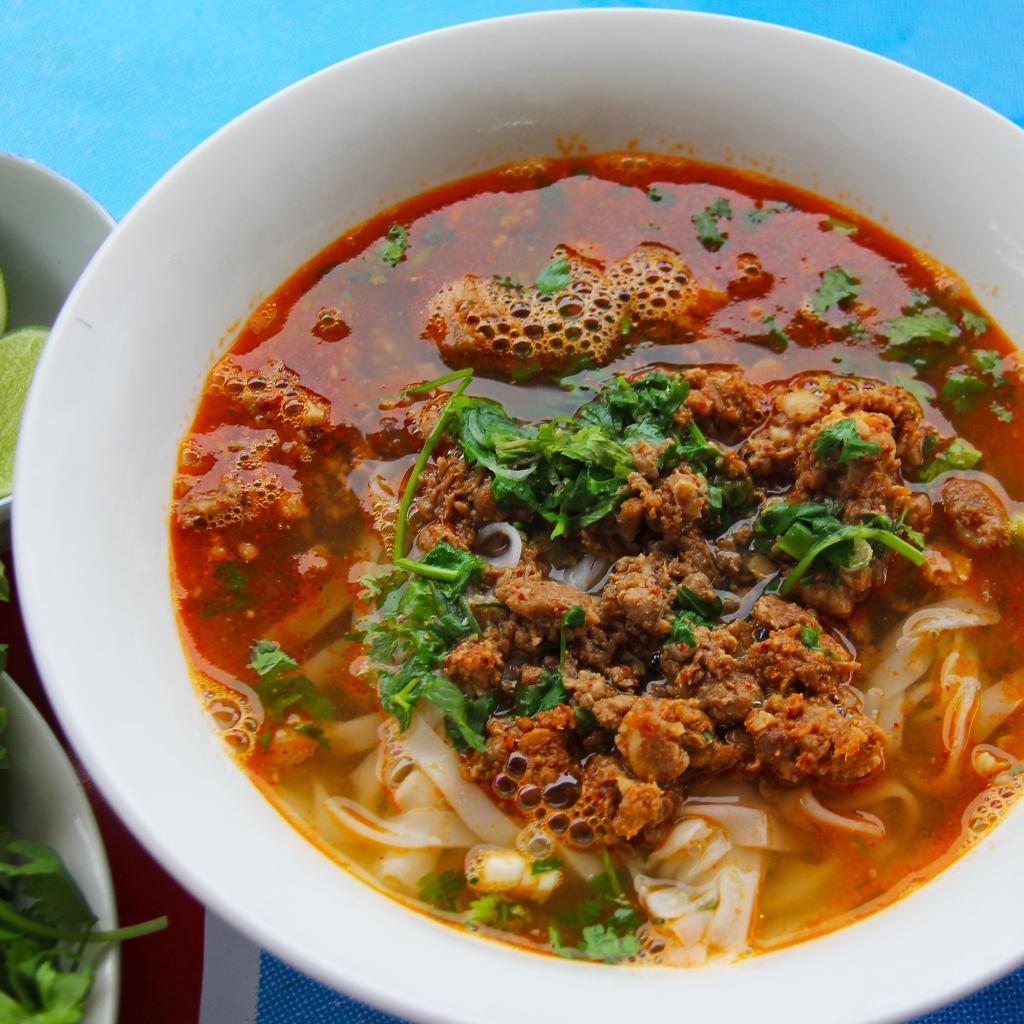 Wallpaper Spicy soup with noodles and meat in a plate with herbs