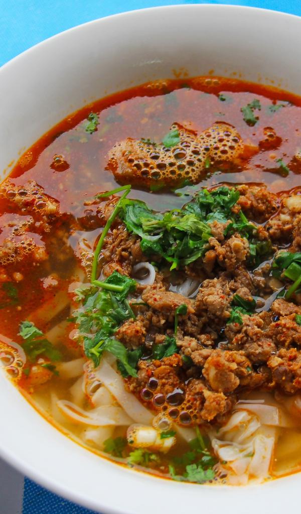 Wallpaper Spicy soup with noodles and meat in a plate with herbs