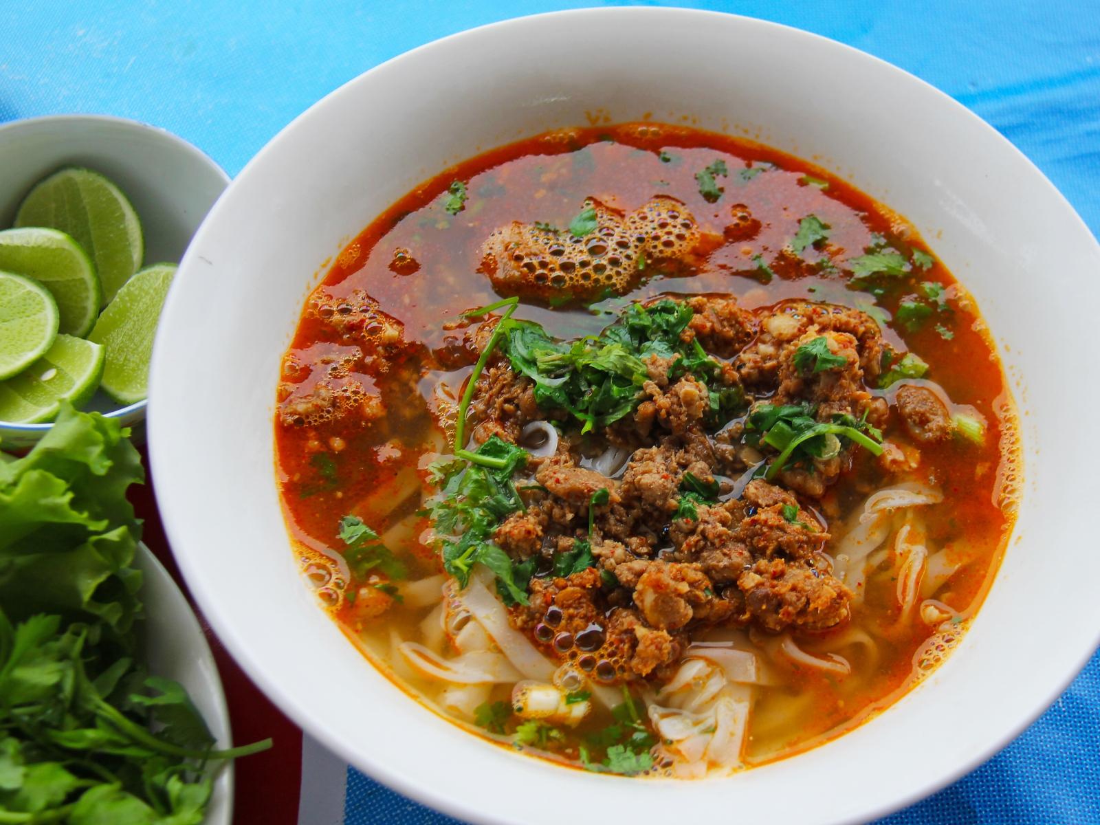 Wallpaper Spicy soup with noodles and meat in a plate with herbs
