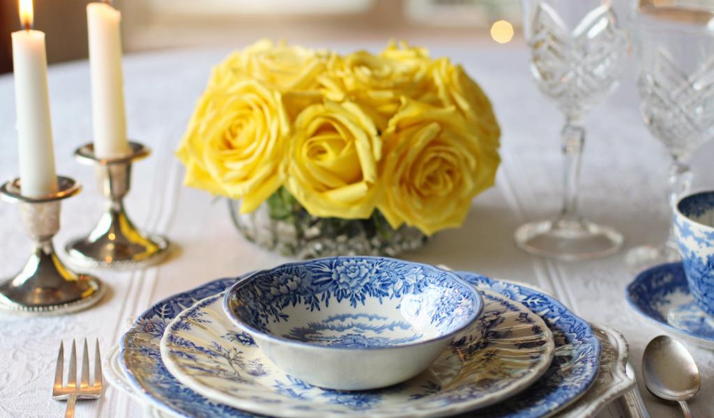 Wallpaper Beautiful dishes on the table with a bouquet of roses and candles