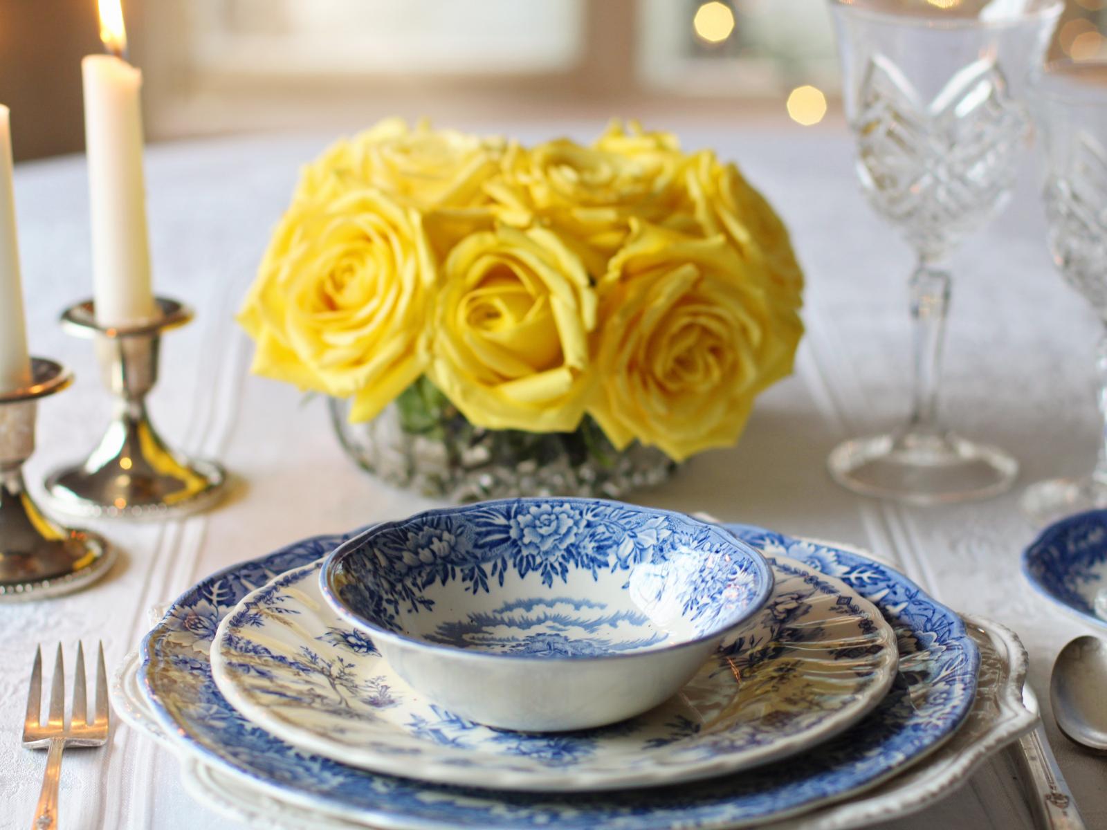 Wallpaper Beautiful dishes on the table with a bouquet of roses and candles