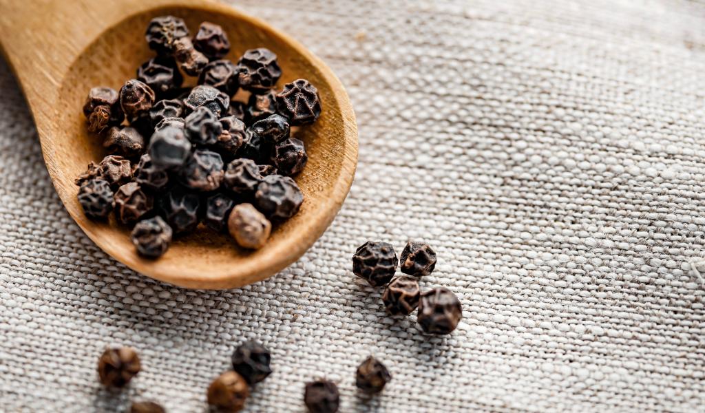 Wallpaper Black peppercorns on a wooden spoon