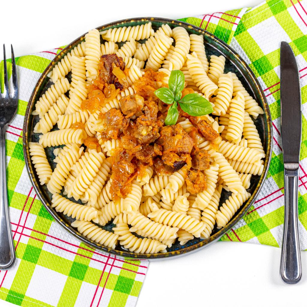 Wallpaper Large plate of pasta with meat on the table with cutlery