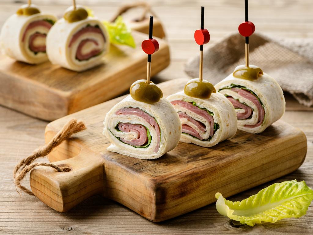 Wallpaper Lavash rolls with ham on the table