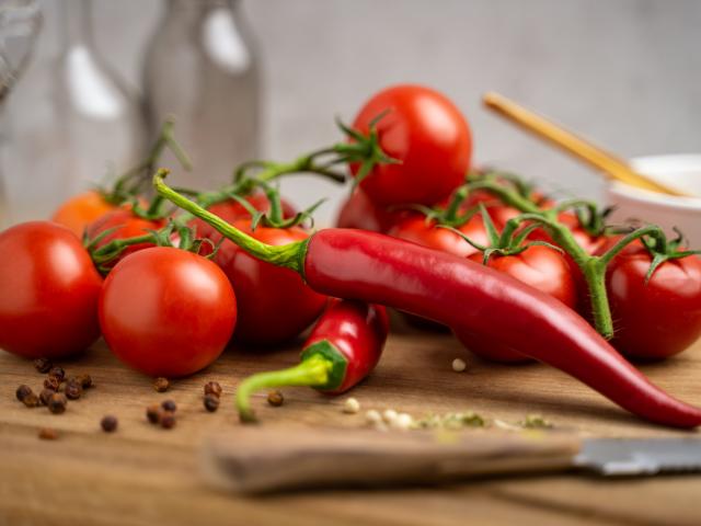 Wallpaper Red hot peppers with tomatoes on the table