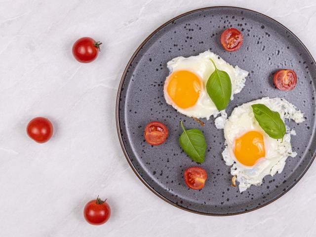 Wallpaper Fried eggs with tomatoes and basil leaves on a black plate