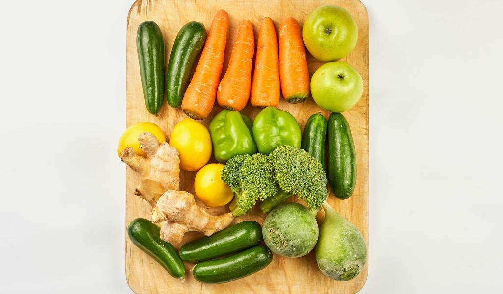 Wallpaper Fresh vegetables and fruits on cutting board