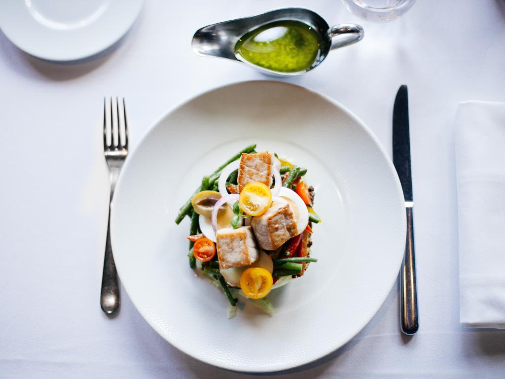 Wallpaper Chicken fillet salad with vegetables on a white plate