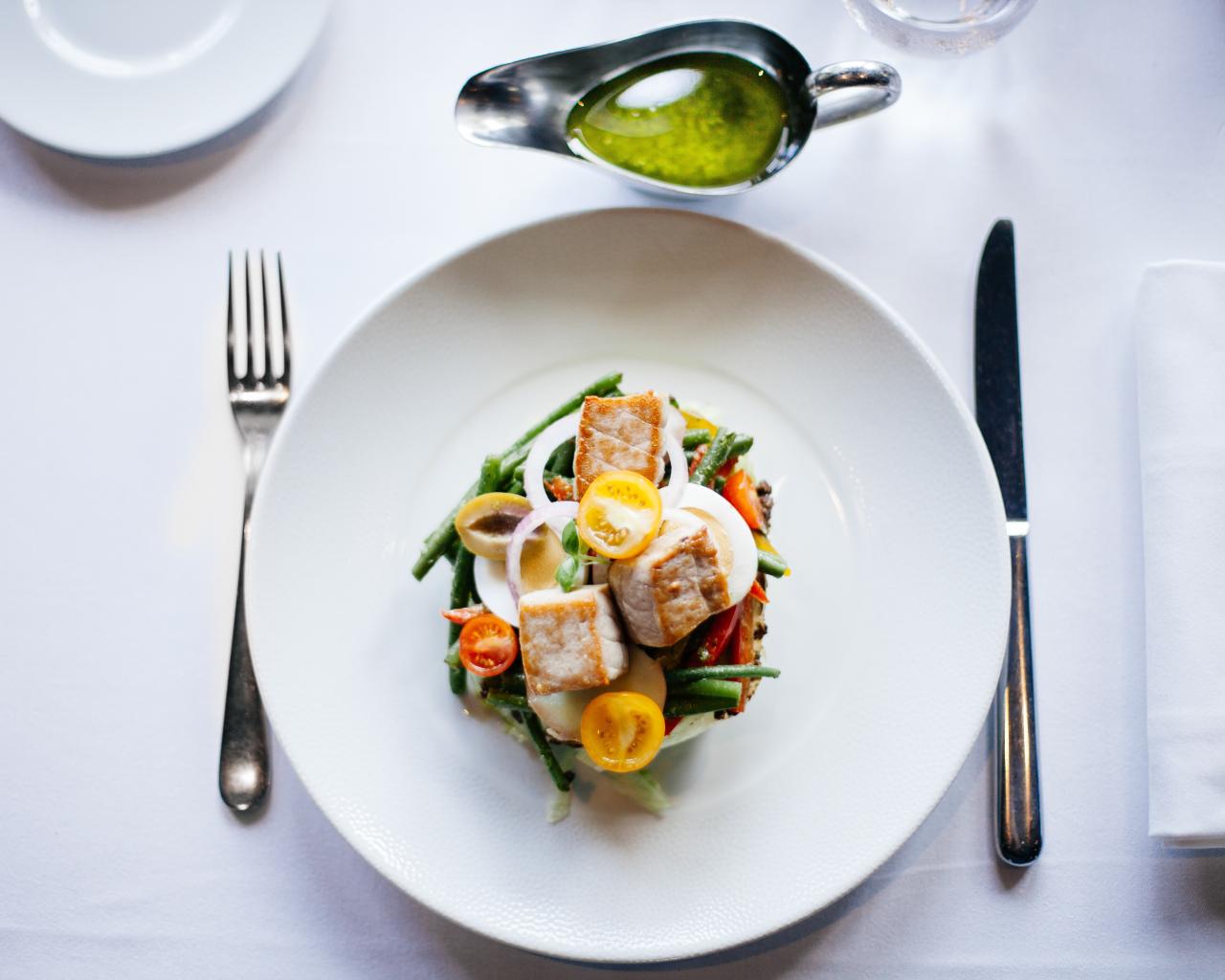 Wallpaper Chicken fillet salad with vegetables on a white plate