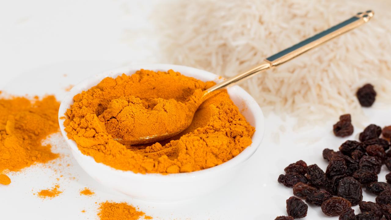 Wallpaper Seasoning turmeric with a spoon on the table with rice and raisins
