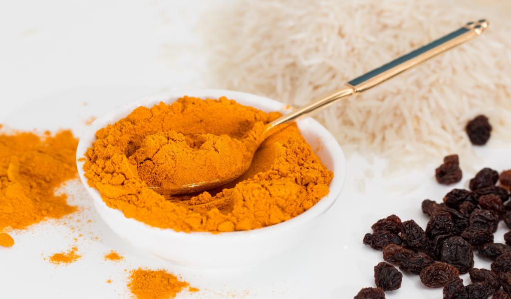 Wallpaper Seasoning turmeric with a spoon on the table with rice and raisins