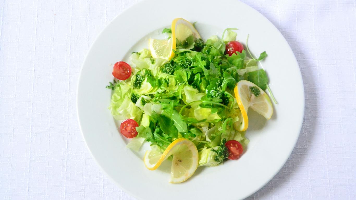 Wallpaper Greens salad with lemon on a white plate