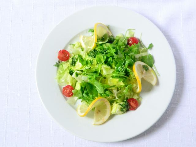Wallpaper Greens salad with lemon on a white plate