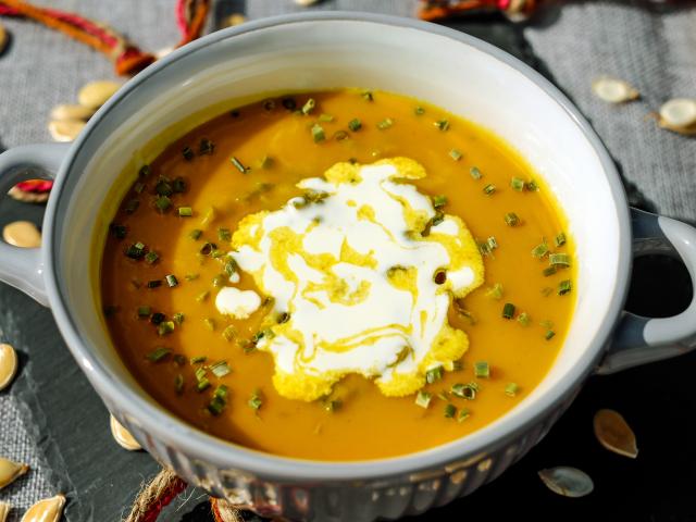 Wallpaper Pumpkin soup with sour cream in a saucepan