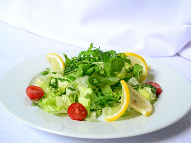 Wallpaper Salad with vegetables and green lettuce leaves in a plate on a table with cutlery
