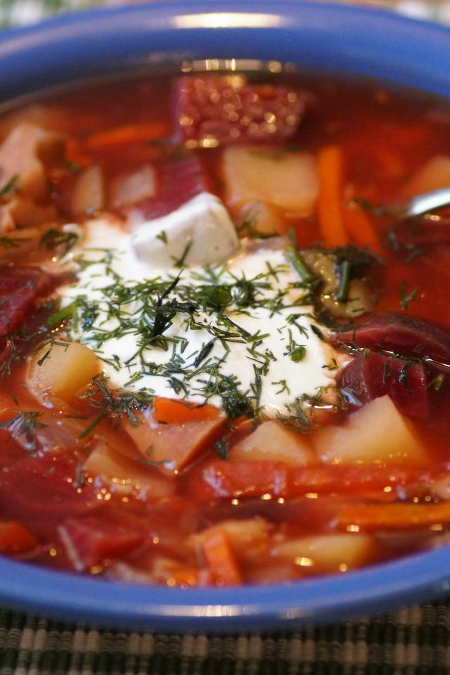 Wallpaper Borscht with sour cream in a blue bowl on the table