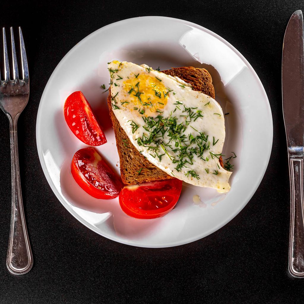 Wallpaper Piece of bread with scrambled eggs on a plate with tomatoes