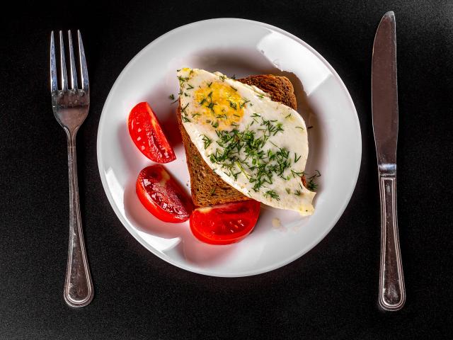 Wallpaper Piece of bread with scrambled eggs on a plate with tomatoes