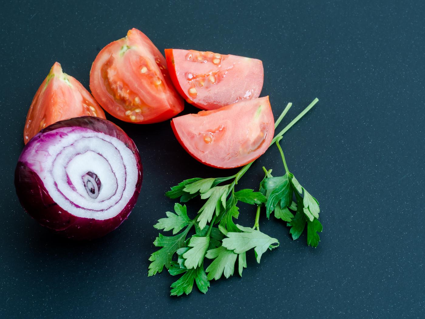 Wallpaper Onions, tomatoes and parsley on a gray table