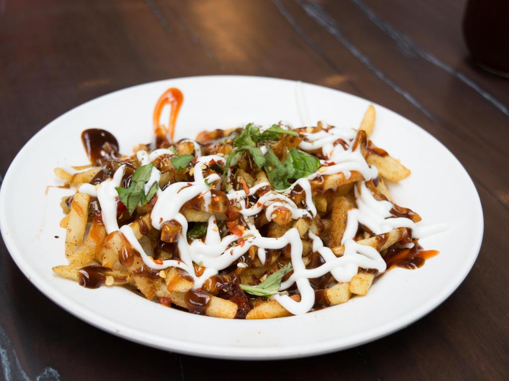 Wallpaper French fries on a plate with sauce and mayonnaise