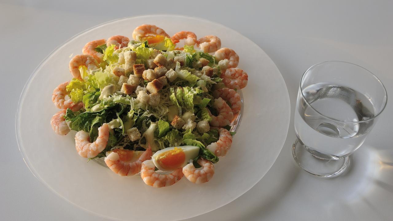 Wallpaper A plate of delicious salad with shrimps on the table with a glass