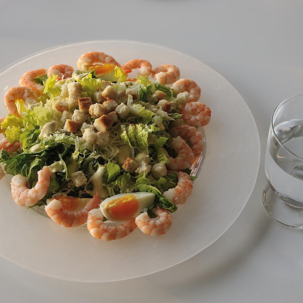 Wallpaper A plate of delicious salad with shrimps on the table with a glass
