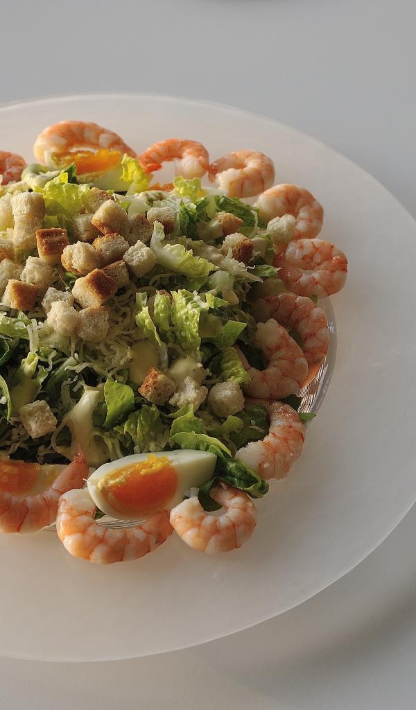 Wallpaper A plate of delicious salad with shrimps on the table with a glass