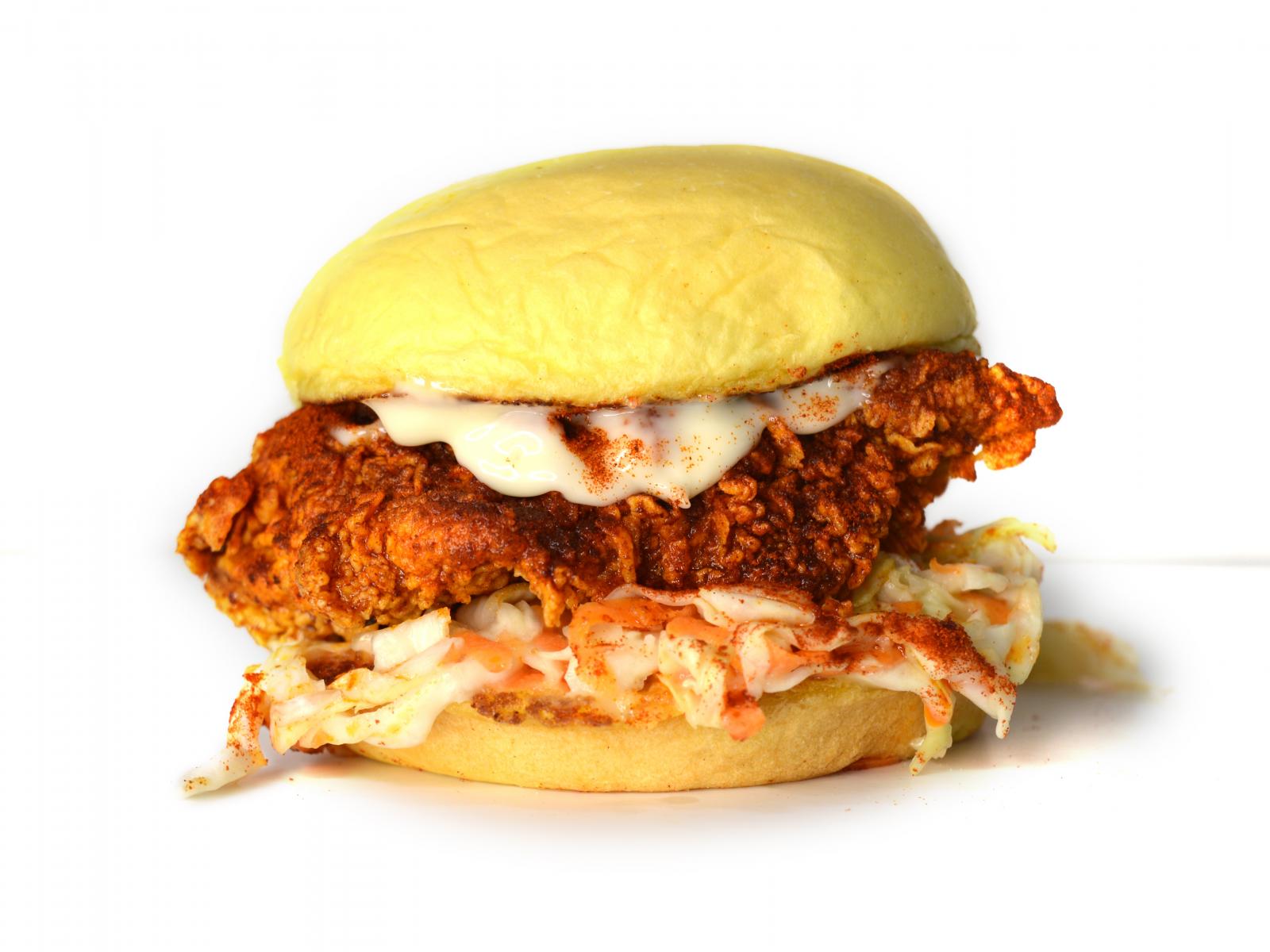 Wallpaper Big chicken burger with sauce on a white plate
