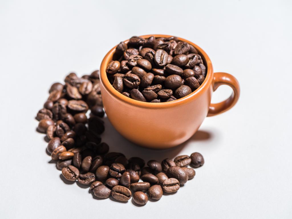 Wallpaper Roasted coffee beans in a mug on a white background