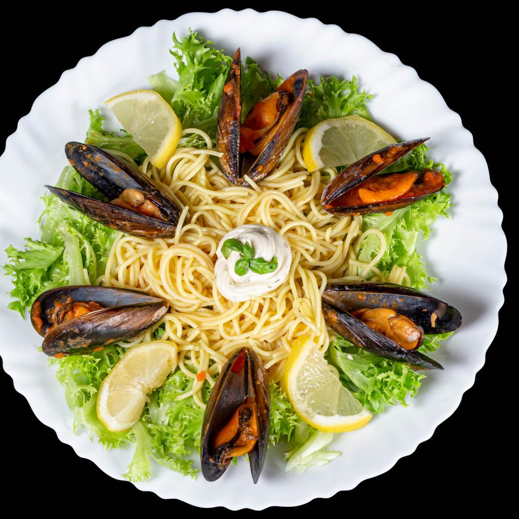 Wallpaper Spaghetti with mussels and lettuce on a white plate