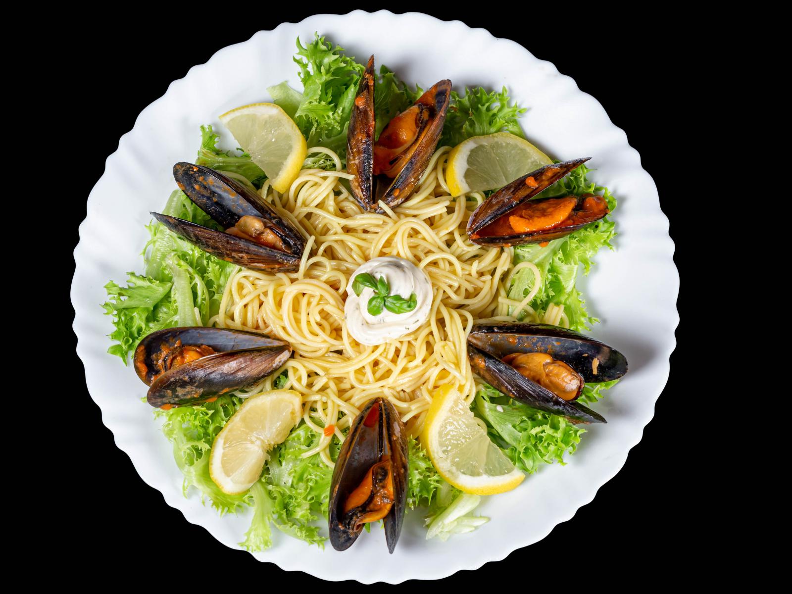 Wallpaper Spaghetti with mussels and lettuce on a white plate
