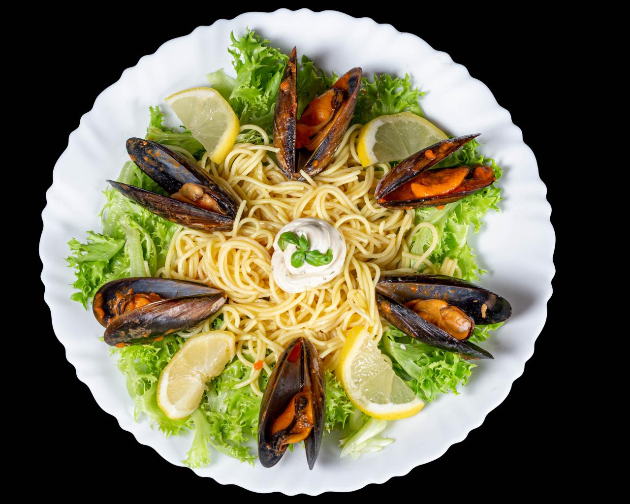 Wallpaper Spaghetti with mussels and lettuce on a white plate