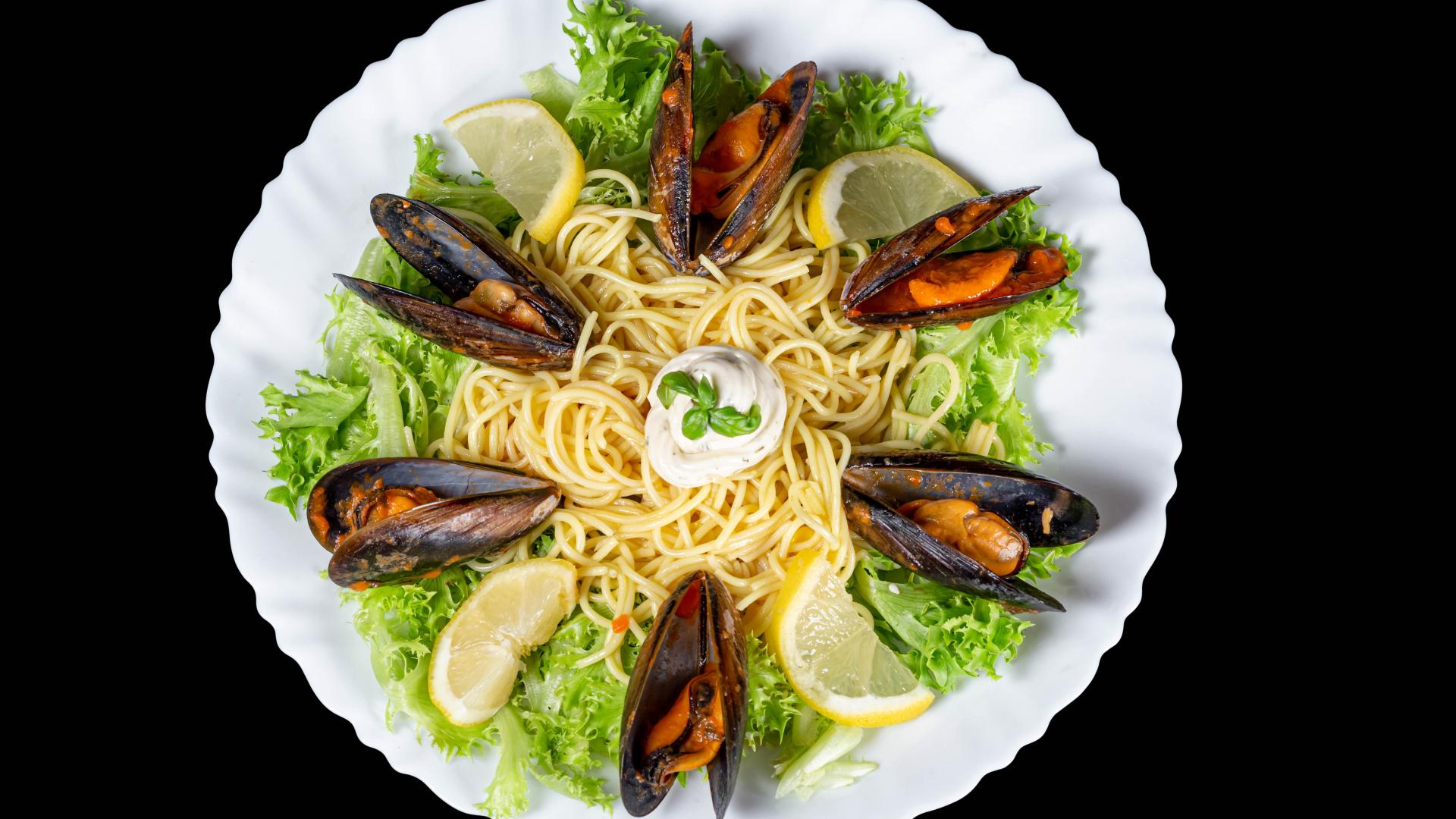 Wallpaper Spaghetti with mussels and lettuce on a white plate