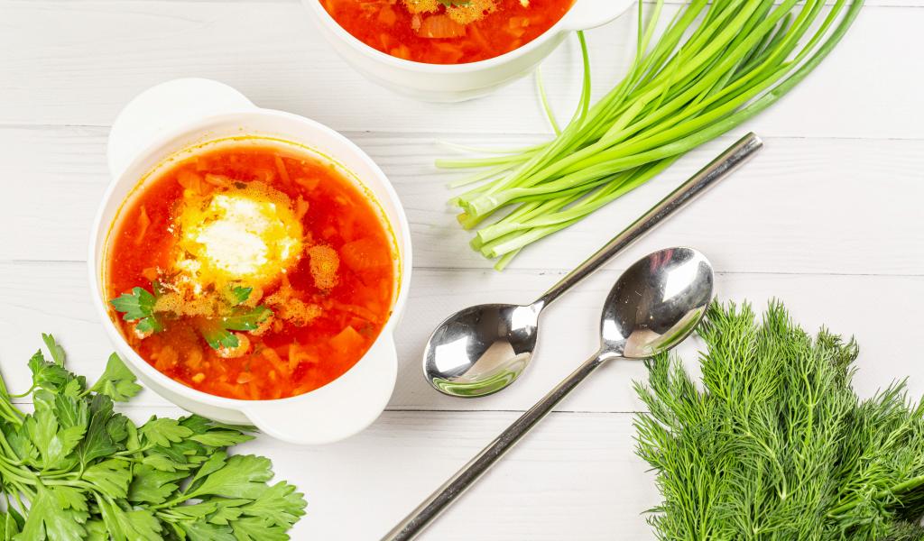 Wallpaper Two plates of borscht on the table with parsley, onion and dill
