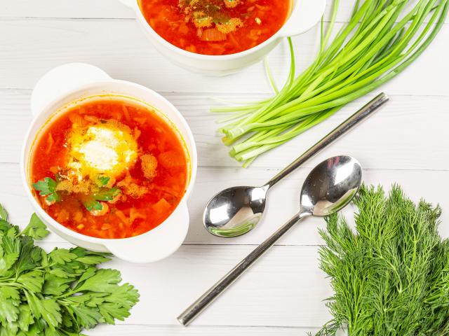 Wallpaper Two plates of borscht on the table with parsley, onion and dill