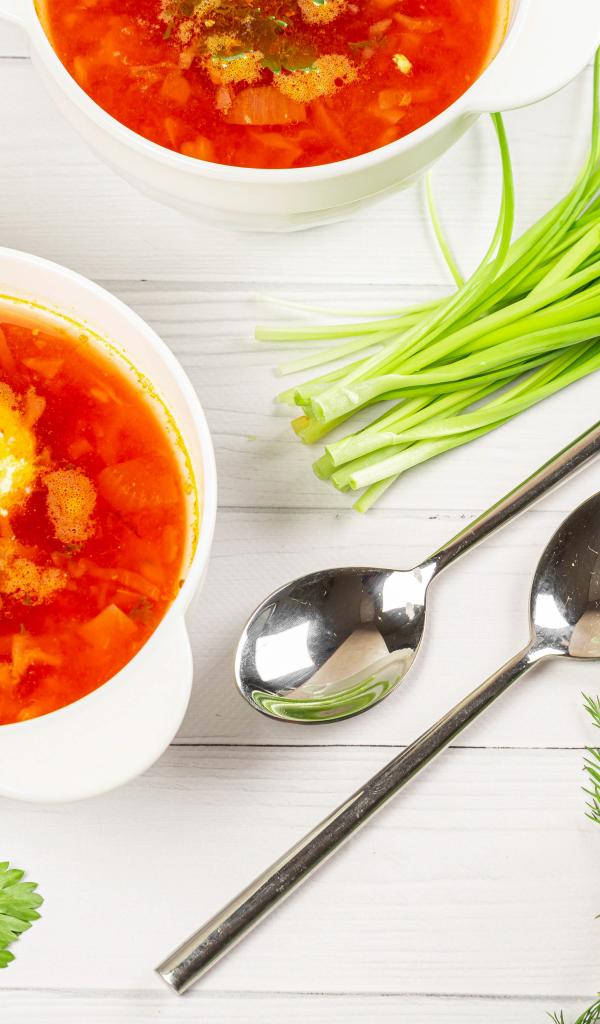 Wallpaper Two plates of borscht on the table with parsley, onion and dill