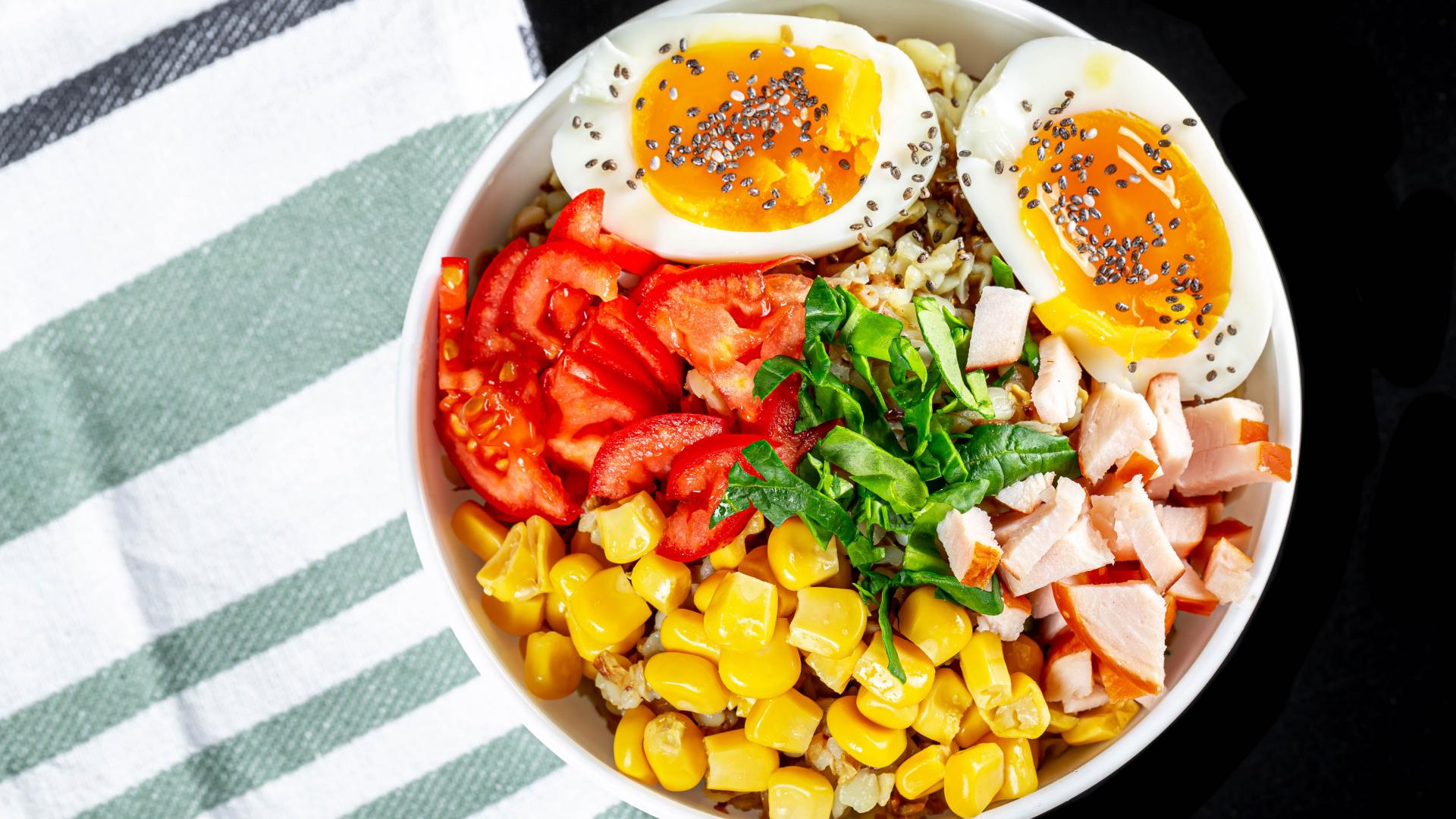 Wallpaper Porridge in a plate with tomatoes, corn, ham and egg