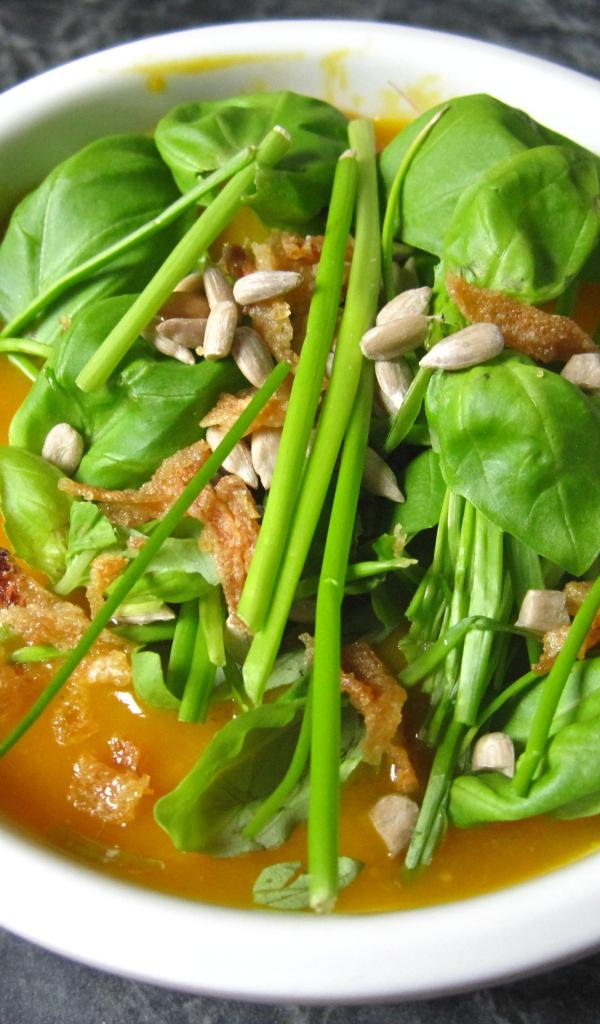 Wallpaper Pumpkin soup with herbs in a white plate