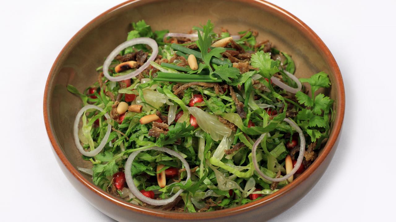 Wallpaper Greens salad with meat on gray background