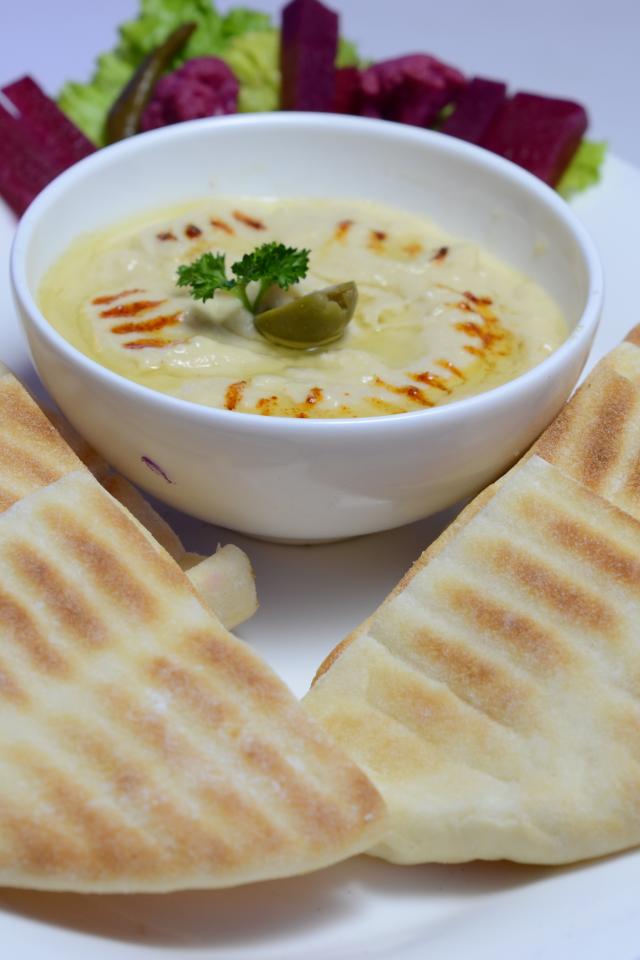 Wallpaper Dish hummus smeared on a plate on a gray background