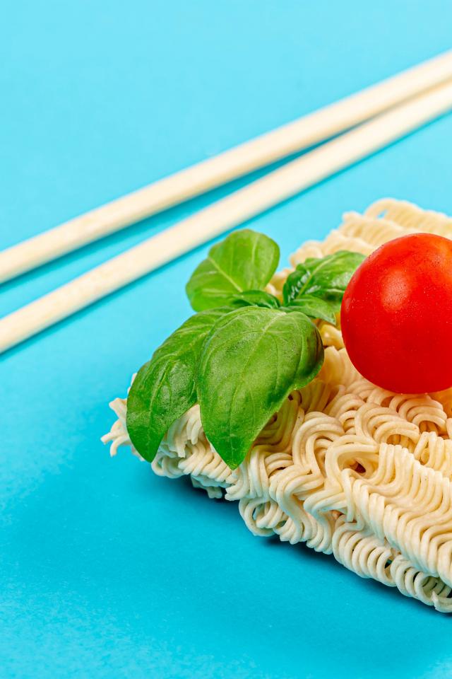 Wallpaper Instant vermicelli on a blue background with chopsticks