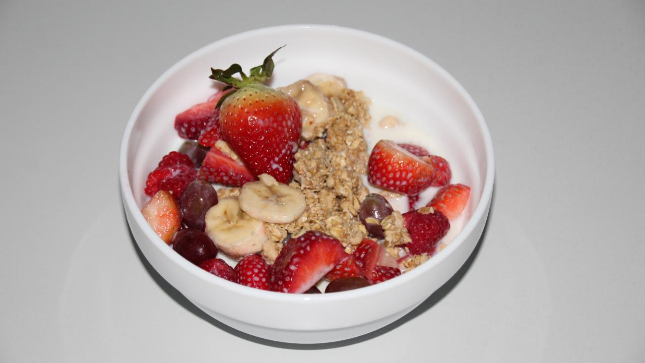Wallpaper Muesli with milk and berries on a gray table
