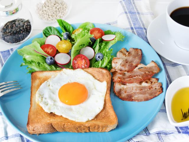 Wallpaper Scrambled eggs with bread on a plate with salad and bacon